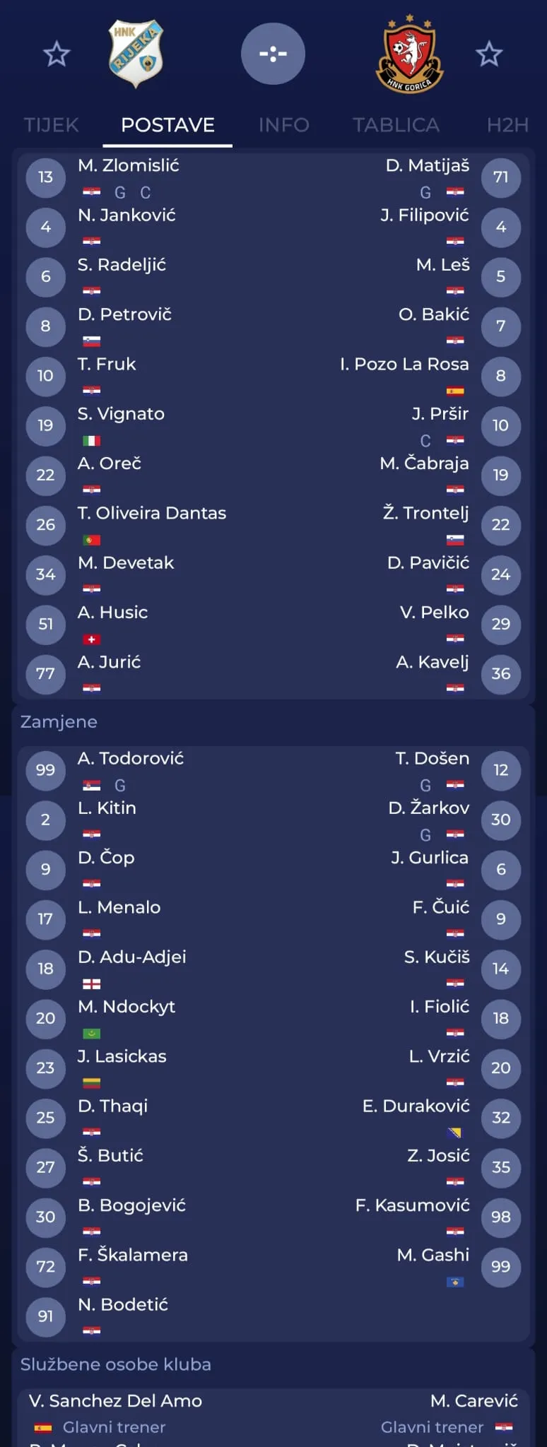 Rijeka (4-4-2): Zlomislić – Oreč, Husić, Radeljić, Devetak – Vignato, Dantas, Petrovič, Janković – Fruk, Jurić. Trener: Victor Sanchez.