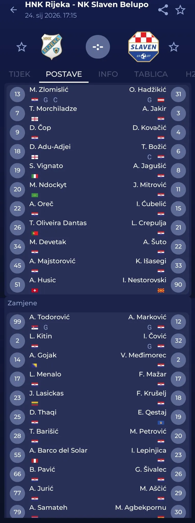 Rijeka (4-4-2): Zlomislić – Oreč, Majstorović, Husić, Devetak – Vignato, Dantas, Ndockyt, Morčiladze– Adu-Adjei, Čop.