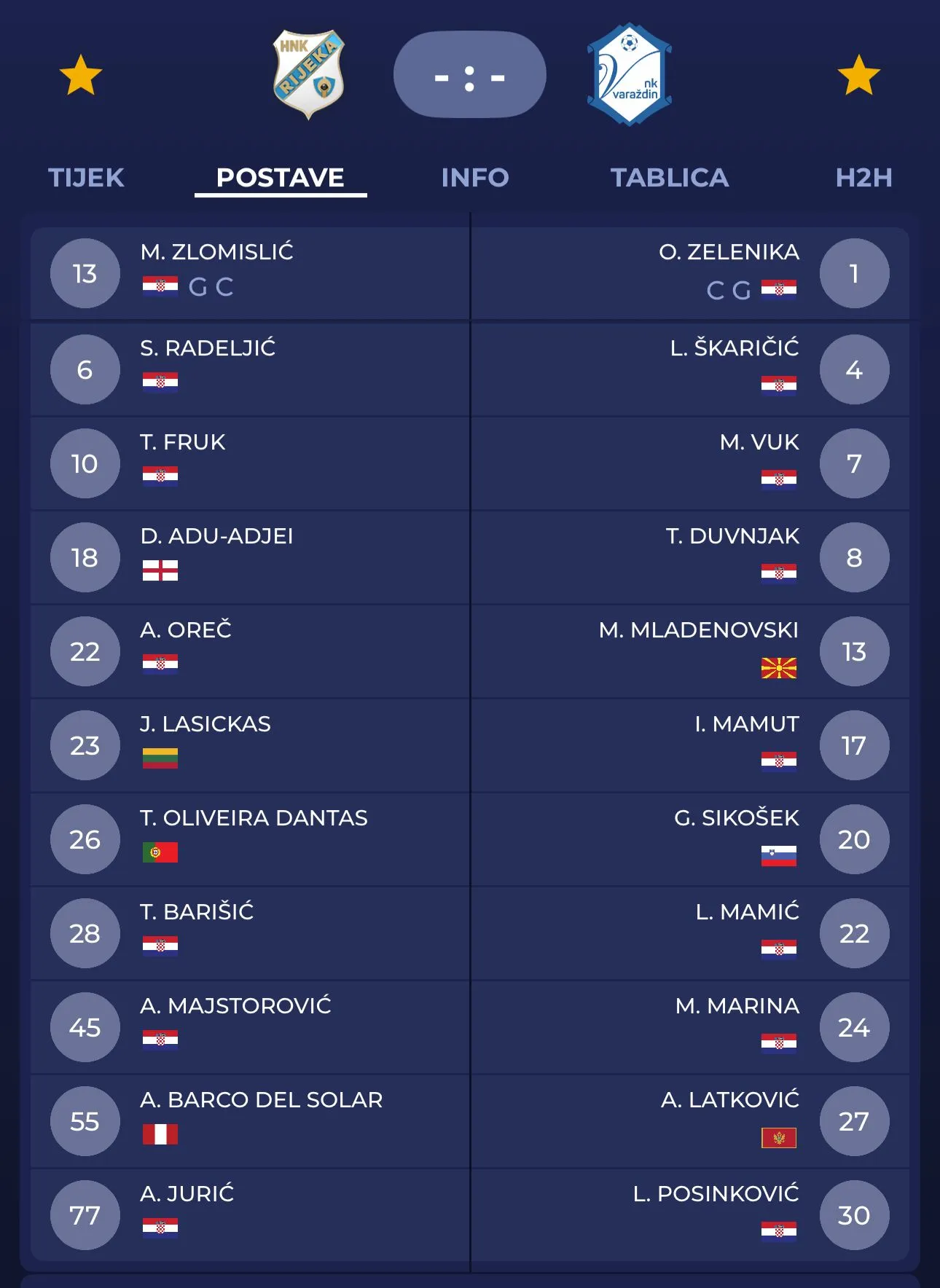 Rijeka (3-4-1-2): Zlomislić – Barišić, Majstorović, Radeljić – Oreč, Dantas, Barco, Lasickas – Fruk – Jurić, Adu-Adjei.
