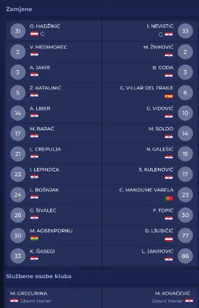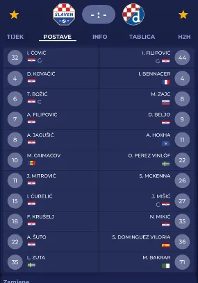 Dinamo (4-3-3): Filipović – Mikić, Dominguez, McKenna, Perez Vinlöf – Bennacer, Mišić, Zajc – Bakrar, Beljo, Hoxha.