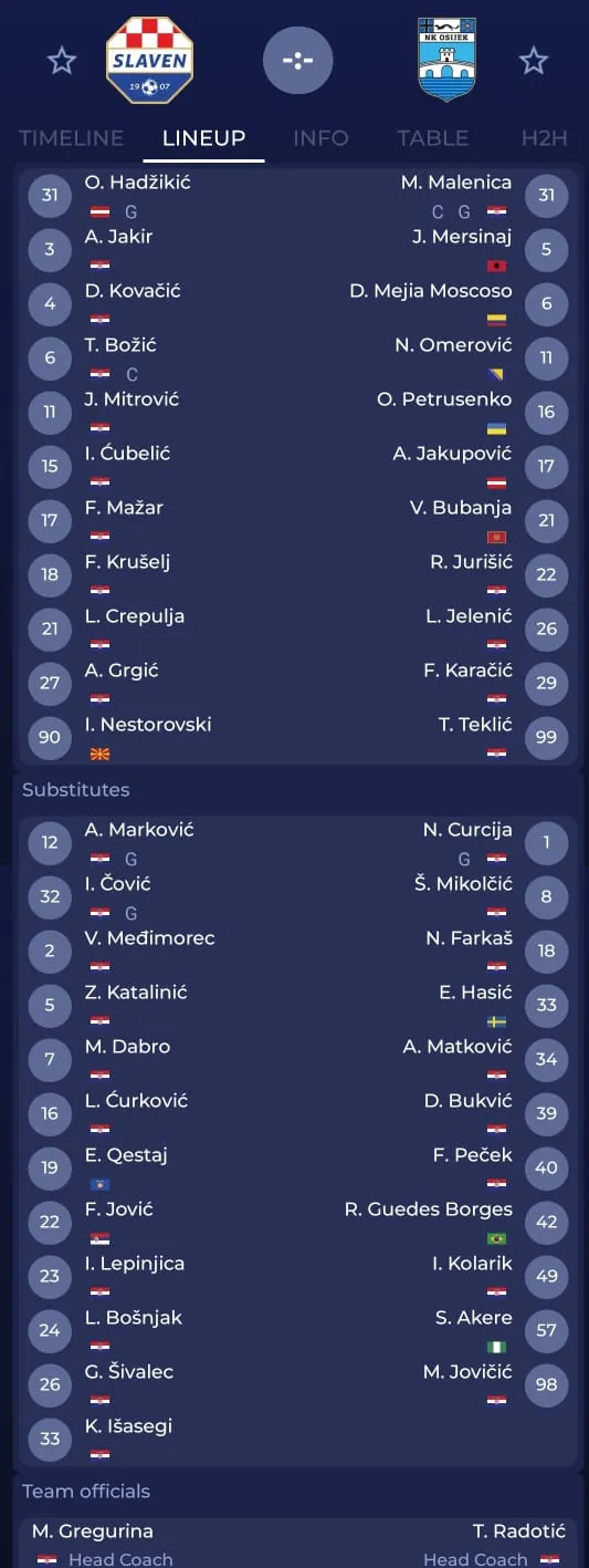 Osijek (4-2-3-1): Malenica - Karačić, Jelenić, Mersinaj, Jurišić - Bubanja, Petrusenko - Mejia, Teklić, Omerović - Jakupović