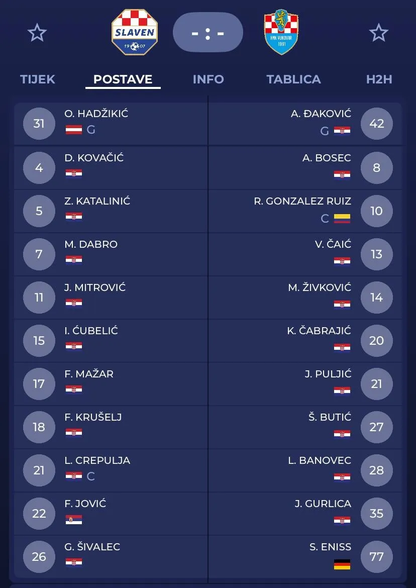 Slaven Belupo (4-2-3-1): Hadžikić – Krušelj, Katalinić, Kovačić, Jović – Crepulja, Ćubelić – Mitrović, Mažar, Šivalec – Dabro. Trener: Mario Gregurina.
