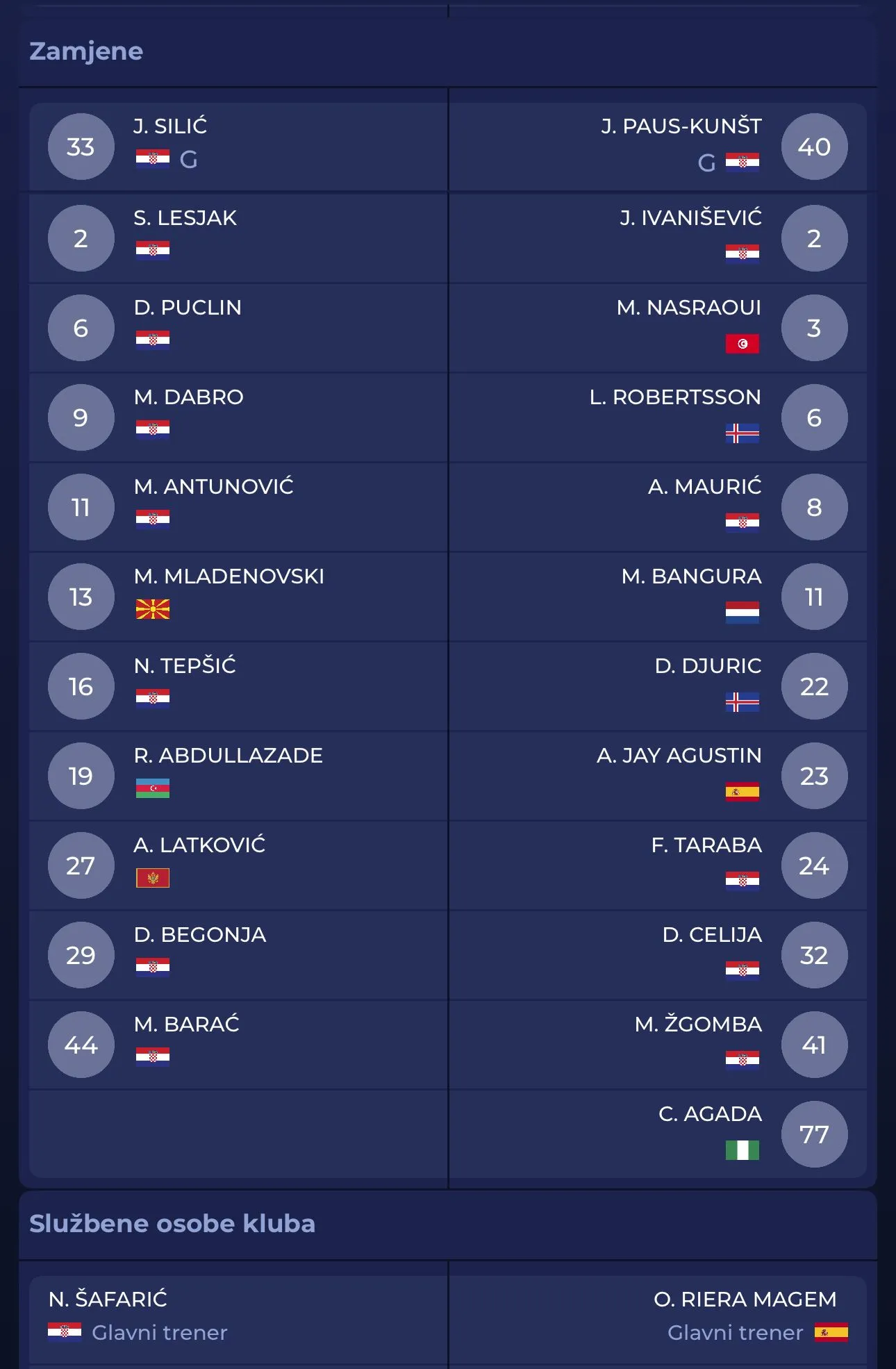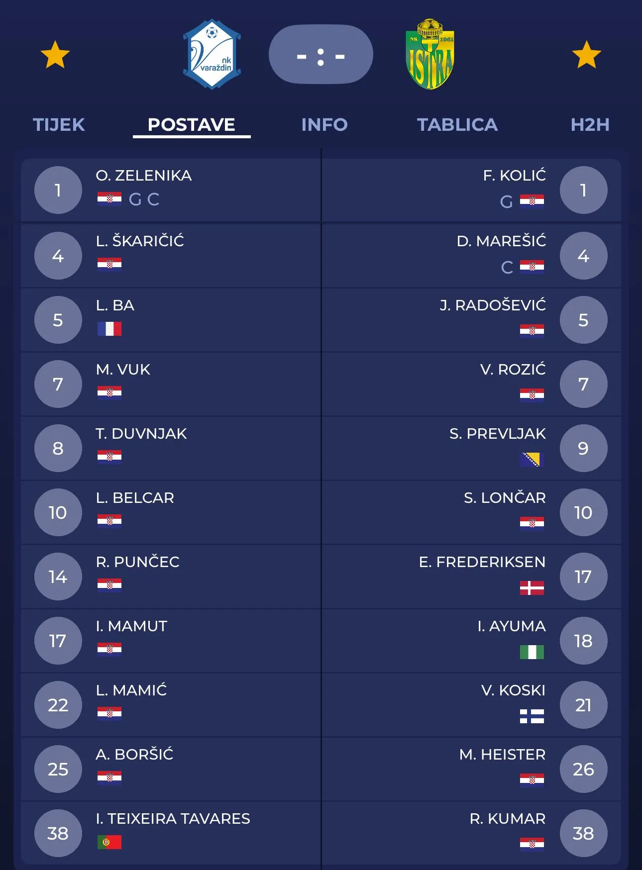 Istra 1961 (3-4-2-1): Kolić – Kumar, Koski, Marešić – Frederiksen, Radošević, Ayuma, Heister – Lončar, Rozić – Prevljak.