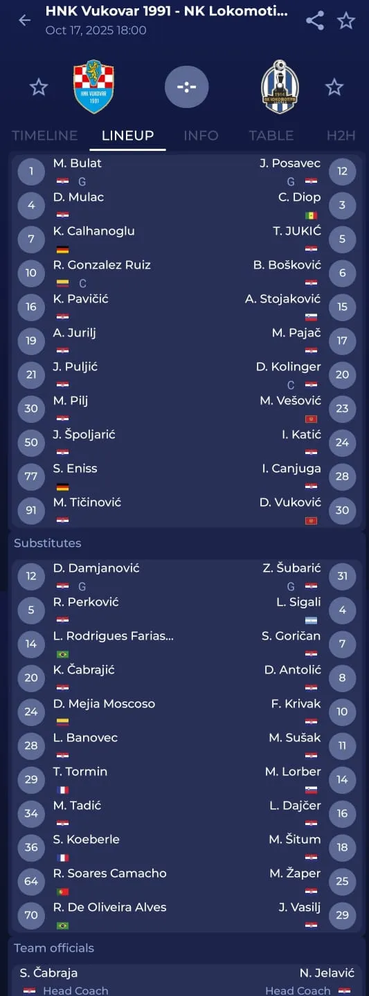Lokomotiva (3-4-2-1): Posavec – Kolinger, Mbacke Diop, Jukić – Vešović, Katić, Bošković, Pajač – Canjuga, Vuković – Stojaković. Trener: Nikica Jelavić.