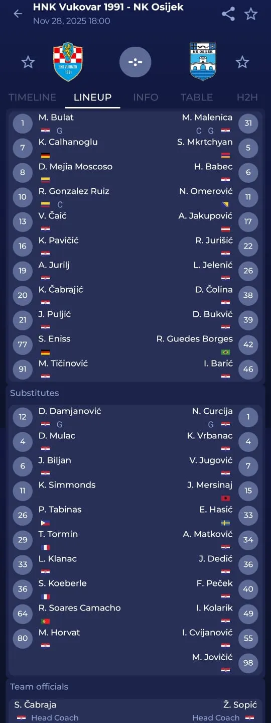 Vukovar (4-2-3-1): Bulat - Tičinović, Čaić, Pavičić, Calhanoglu - Mejia, Shabani - Jurilj, Gonzalez, Čabrajić - Puljić