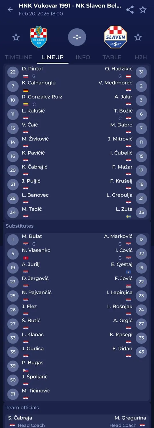 Slaven Belupo (4-3-3): Hadžikić – Krušelj, Božić, Međimorec, Žuta – Crepulja, Ćubelić – Mitrović, Mažar, Jakir – Dabro.