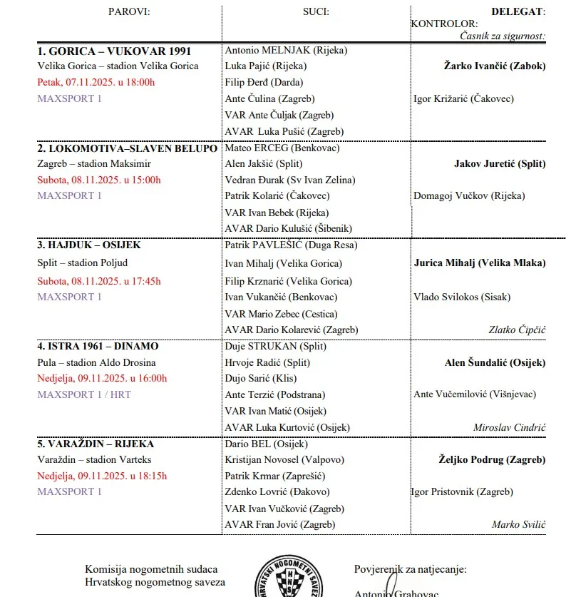I za kraj, nedjeljni sraz Varaždina i Rijeke pripao je Dariju Belu (Osijek), VAR je Ivan Vučković (Zagreb).