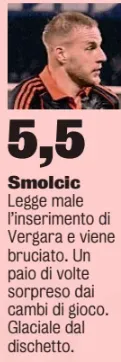 Ivan Smolčić dobio je nešto šareniju, ali ukupno pozitivnu sliku. Gazzetta dello Sport mu je dala 5,5 uz kritiku zbog lošeg čitanja utrčavanja Vergare za 1-1 i problema kod promjene strana u igri, ali uz pohvalu što je bio “leden” na 11-ercu. Drugi portali vide ga znatno bolje: ocjene se kreću od 6 do 7, a Tuttomercatoweb ističe da je “držao visoku liniju u teškoj noći protiv Vergare i Olivere koji su ga uznemiravali po njegovoj strani te izborio ključni jedanaesterac u duelu s Oliverom kojim je Como poveo 1-0.”