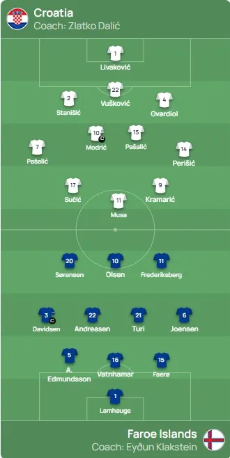 Hrvatska (3-4-2-1): Livaković - Stanišić, Vušković, Gvardiol - Marco Pašalić, P. Sučić, Modrić, Perišić - Mario Pašalić, Kramarić - Matanović. Izbornik: Zlatko Dalić.